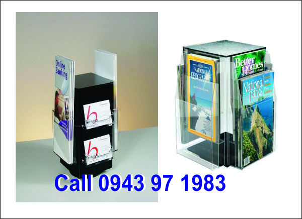 Chúng tôi có mẫu sản phẩm Kệ đựng quảng cáo mica xoay 3 mặt mẫu với kích thước cỡ A4,A5, A6. Sản phẩm gồm thân bằng mica trong, thân trụ hình tam giác màu xanh coban, màu đen hoặc màu theo yêu cầu của quý khách , đế bằng 2 tấm mica đen ghép lại với nhau, nội dung được cho vào 3 mặt kệ.