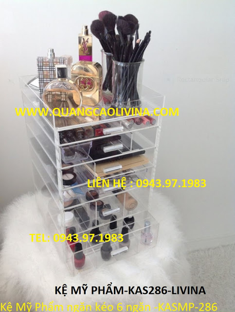 Kệ mỹ phẩm được làm từ Mica có giá thành rẻ, tiết kiệm được chi phí cho phái đẹp.Kệ mỹ phẩm có thể để bàn hoặc để đất, giúp bạn sắp xếp được những mỹ phẩm của mình một cách hệ thống dễ kiểm soát, tránh thất lạc.Giúp cho thẩm mỹ cho góc bàn trang điểm nhỏ xinh của bạn, sản phẩm luôn được bảo quản trong điều kiện sạch sẽ, gọn gàng.