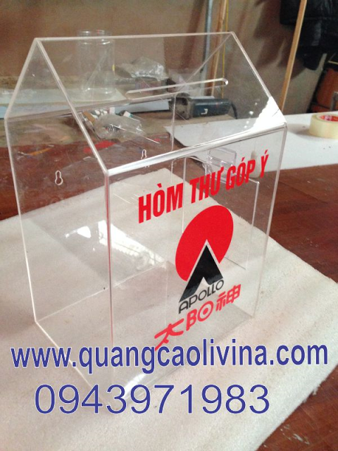 Do được làm từ chất liệu Mica, nên nó được sử dụng vượt hơn so với chất liệu bằng thủy tinh,Hòm thư góp ý hình mái nhà, hòm từ thiện, hòm mica theo kích cỡ và mẫu mã khách nhau  là dạng mica trong suốt, không dễ vỡ, không nứt và cách nhiệt tốt.