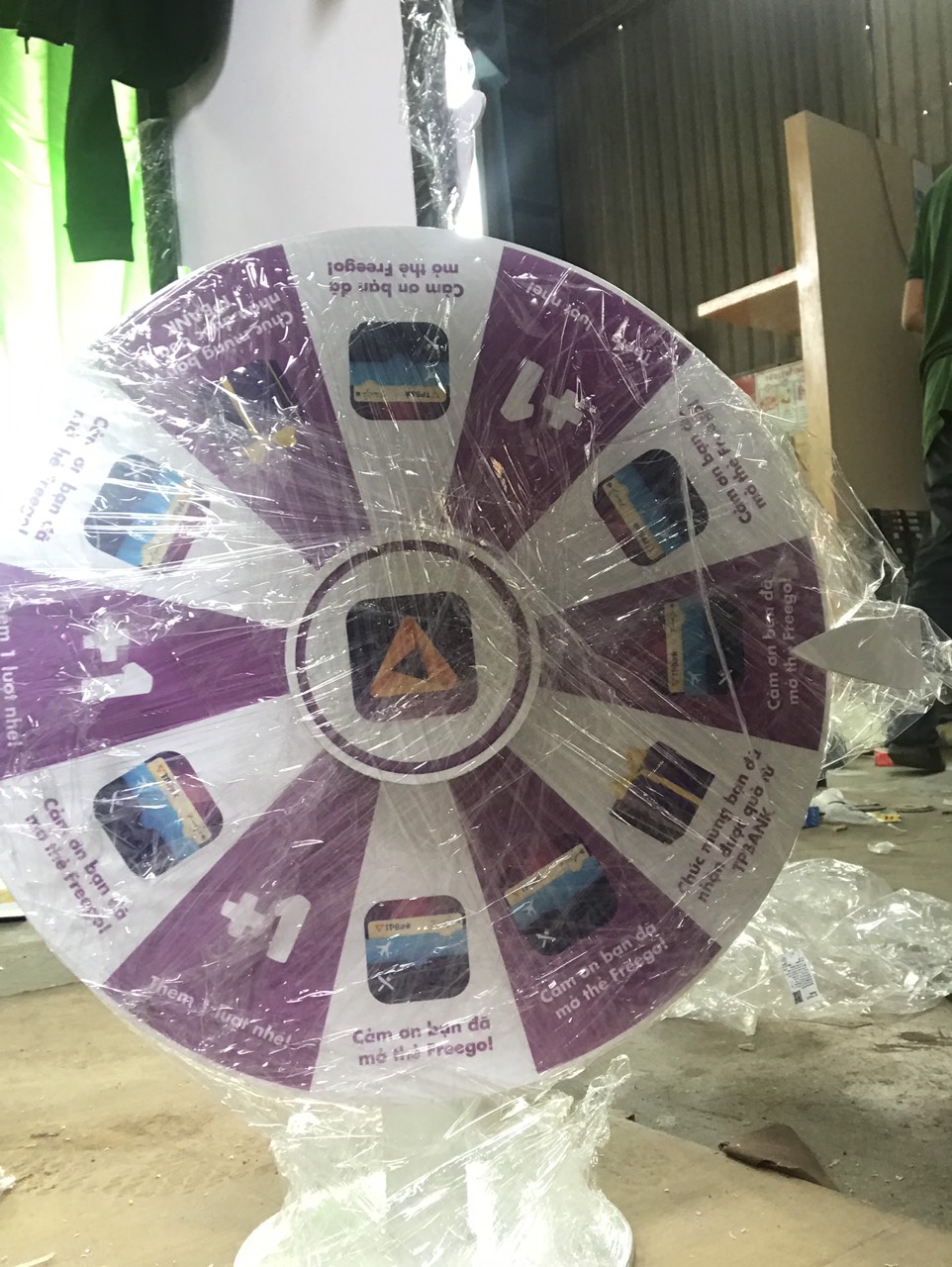 Vòng quay được in và dán decal ở các mặt sao cho phù hợp với nhu cầu mẫu mã của quý khách hàng. Quý khách chỉ cần thiết kế sau đó cung cấp file cho chúng tôi, vòng quay sẽ được thợ kĩ thuật của chúng tôi dán làm sao cho phù hợp theo file thiết kế mà quý khách hàng đã đưa ra.