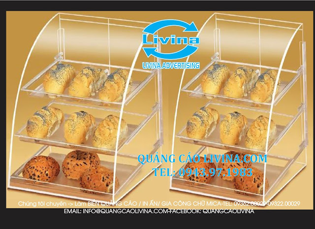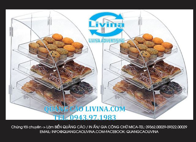 Hộp đựng bánh ngọt bằng mica được dùng để đặt tại bàn bán hàng, trên quầy bán hàng của các tiệm bang, cửa hàng bán bánh, để trưng bày, bảo quản các mẫu bánh để khách hàng tiện tham khảo cũng như để bảo vệ sản phẩm khỏi các tác nhân gây bẩn sản phẩm. Sản phẩm có nhiều mẫu khác nhau có dạng một tầng có dạng nhiều tầng để có thể để được nhiều sản phẩm. Để sản phẩm phong phú đa dạng hơn chúng tôi có thể uốn theo yêu cầu của quý khách hoặc chúng tôi cũng có thể sản xuất theo thiết kế của quý khách.