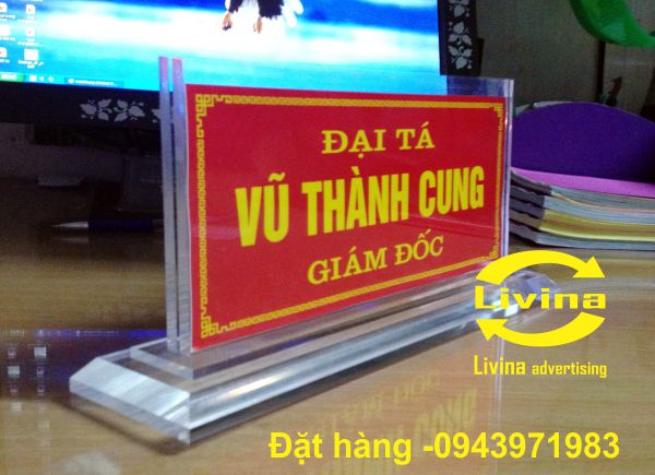 Biển chức danh để bàn thường ghi tên người được sử dụng, dòng dưới ghi chức danh chức vụ đi kèm. Bạn cần làm biển chức danh khi thay đổi một vị trí làm việc trong tổ chức doanh nghiệp.