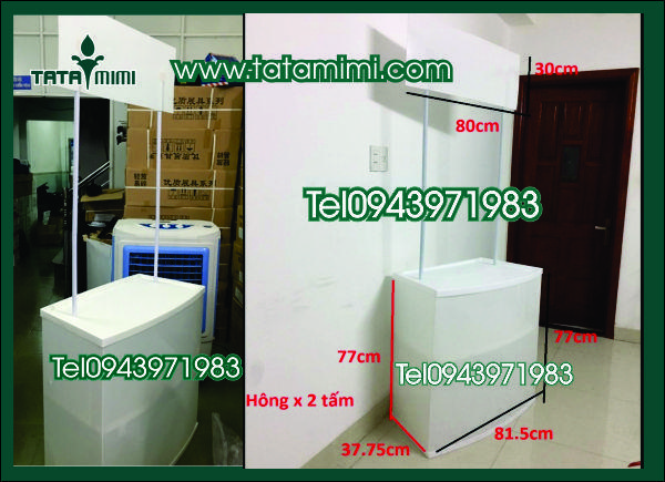 Quầy hàng lưu động sử dụng cho nhiều ngành hàng khách nhau . Nội dung của quầy hàng được thiết kế theo yêu cầu của khách hàng,dán decal tràn ở các mặt. Quầy hàng có ngăn kéo là 2 hoặc 3 ngăn bên trong quầy để đồ bên trong rất tiện lợi.