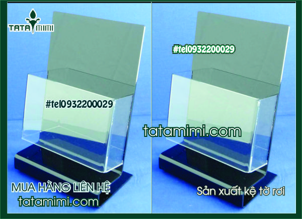 .Trong số các chất liệu được ưa chuộng Kệ tờ rơi được các doanh nghiệp tin dùng hiện nay có mica. Các sản phẩm kệ mica đựng tờ rơi đa dạng kích thước, giúp người dùng chọn lựa sử dụng đáp ứng trong các trường Kệ tờ rơi 3 ngăn. Kệ 4 ngăn. Ngoài công dụng đựng tờ rơi, các mẫu kệ mica đựng tờ rơi còn được sử dụng rộng rãi tại văn phòng nhằm mục đích đựng các loại giấy tờ với các khổ giấy A4, A5, A6,... Quy trình sản xuất Kệ mica đựng tờ rơi được thiết lập một cách chuyên nghiệp tờ khâu thiết kế file đến khâu cắt khắc mica
