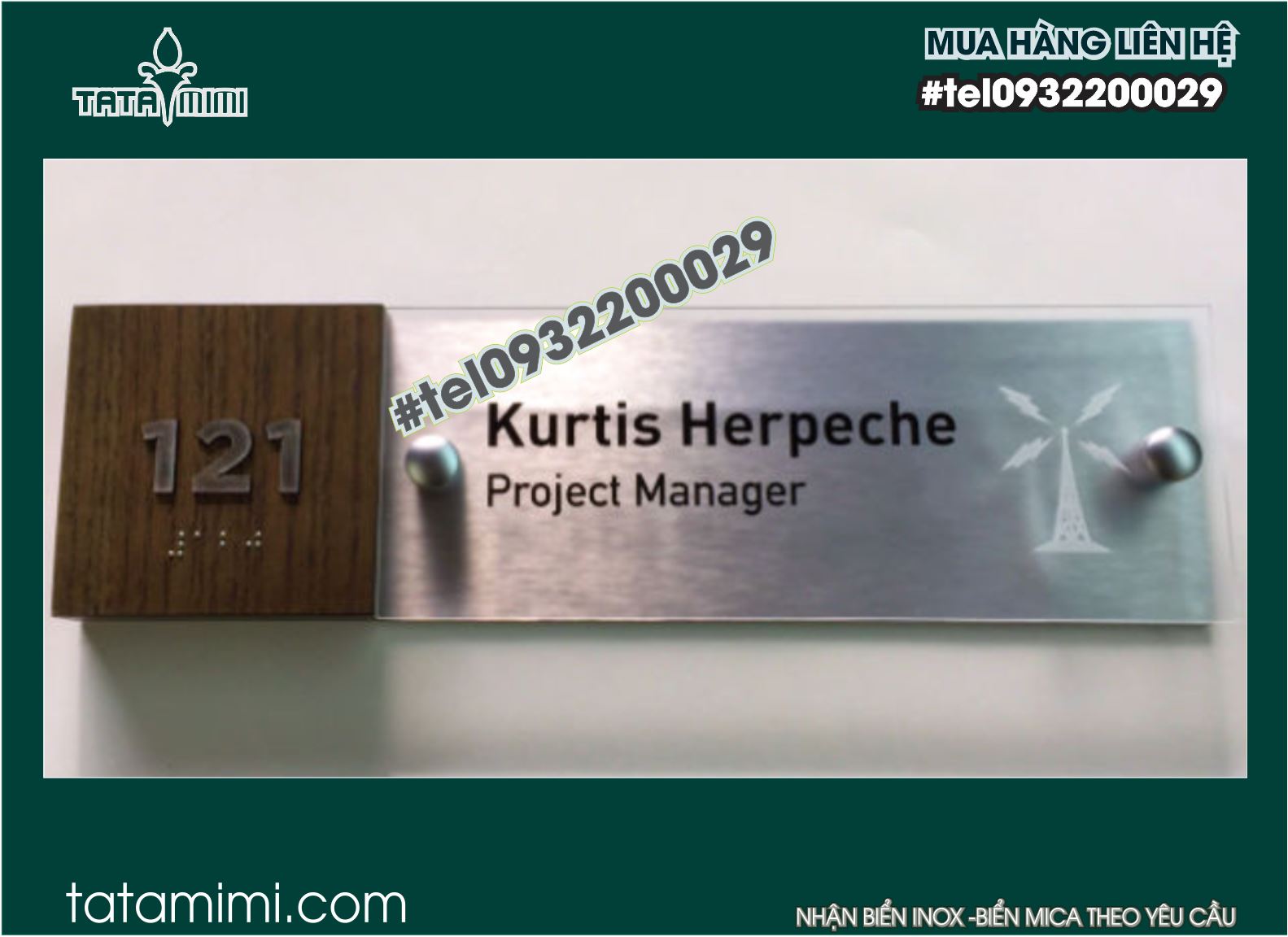 Kích thước của Biển phòng ban kết hợp giữa mica và alu là 30x15cm, làm bằng Mica 2mm, được phun sơn màu đồng lên mặt Mica và có ghi tên, chức danh phòng ban của một cá nhân. Biển phòng ban được sử dụng ở các công ty, các đơn vị, các cơ quan nhà nước.