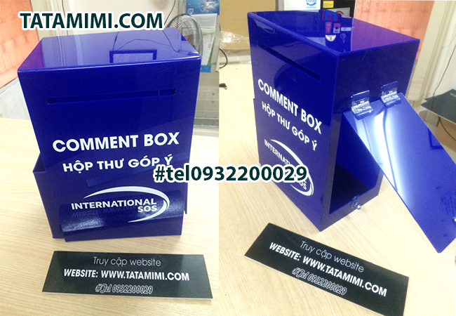 Chúng tôi chuyên nhận đặt hàng theo những mẫu mã của khách hàng, phù hợp với nhu cầu tiêu thụ trên thị trường. Những sản phẩm được công ty phân phối hiện nay luôn hướng đến tính bền, tính thẩm mĩ cao . Sản phẩm của công ty chúng tôi luôn được đánh giá chất lượng, được nhiều khách hàng lựa chọn.Hòm thư góp ý Sản phẩm được làm từ mica trong suốt nên nó giúp nhìn thấy rõ được nội dung truyền tải bên trong. Không những vậy, những sản phẩm được làm từ mica có tính thẩm mĩ cao, dễ quan sát và vượt trội hơn những sản phẩm được làm từ thủy tinh.